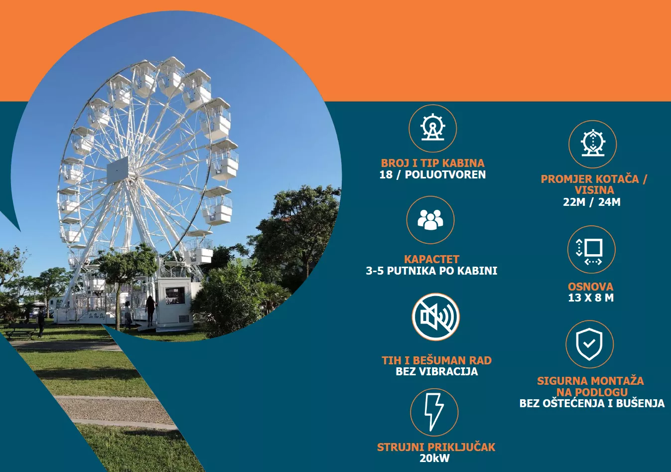 Na lokacijama naših događanja panoramski kotač omogućuje vam da se uzdižete iznad horizonta i uživate u pogledu koji povezuje događanje i okolnu panoramu – idealno za obiteljske trenutke, romantične zalaske sunca ili upečatljive fotografije za sjećanje. Moderne gondole nude udobnu vožnju koja traje nekoliko minuta, pružajući neponovljiv pogled iz visine i jedinstvenu priliku za vidjeti sve iz nove perspektive.