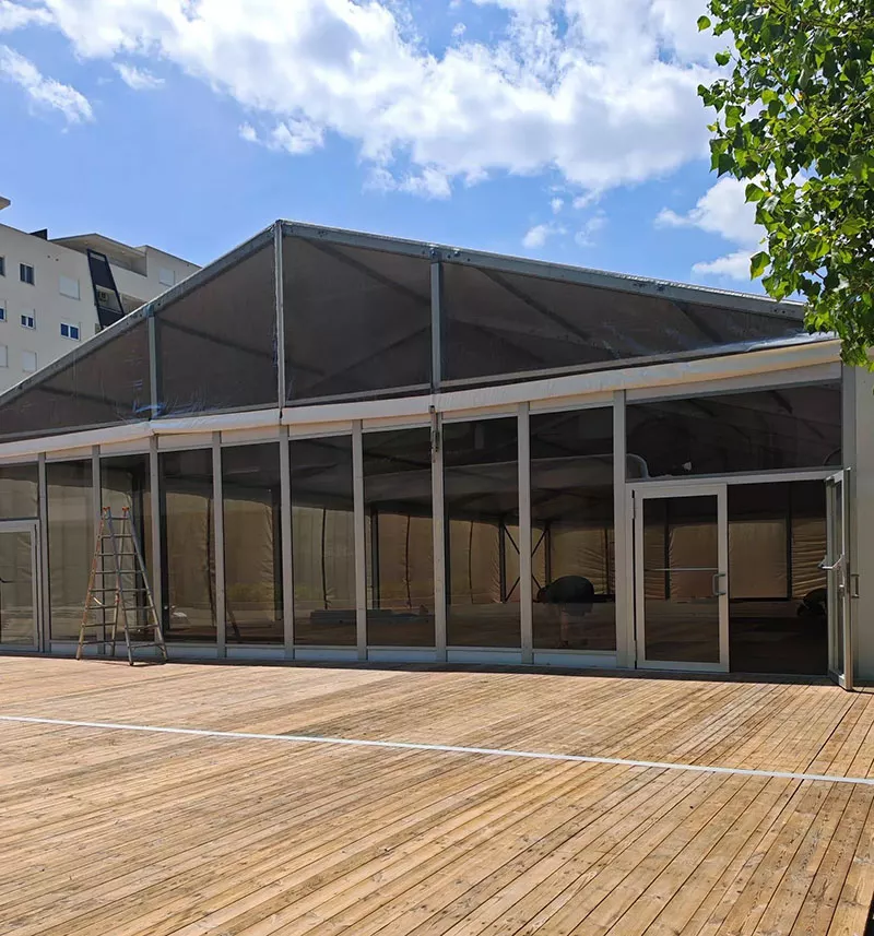Drveni pod pruža prirodan izgled i toplinu prostora uz istovremeno visoku nosivost i stabilnost konstrukcije. Postavlja se na prilagodljive nosače koji omogućuju precizno niveliranje i na zahtjevnijim terenima, čime se dobiva ravna i sigurna površina za kretanje, plesne podije, ugostiteljske zone ili zatvorene šatorske konstrukcije. Zahvaljujući kvalitetnoj obradi i otpornosti na opterećenje, drveni pod predstavlja estetski i funkcionalno pouzdano rješenje za različite vrste događanja i privremenih objekata.
