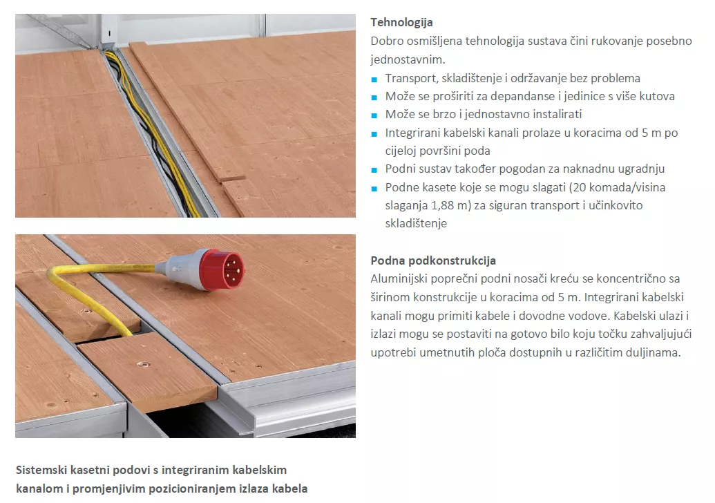 Kazetni pod predstavlja robusno i pouzdano rješenje za privremene i polutrajne konstrukcije gdje su stabilnost i ravnina površine ključni. Zahvaljujući čvrstoj metalnoj podkonstrukciji i izdržljivoj drvenoj gornjoj plohi, sustav omogućuje visoku nosivost te precizno niveliranje i na neravnom terenu. Idealan je za pozornice, plesne podije, event zone, šatore i VIP prostore, gdje je potrebna estetski uredna, sigurna i profesionalna podna površina uz brzu montažu i demontažu.