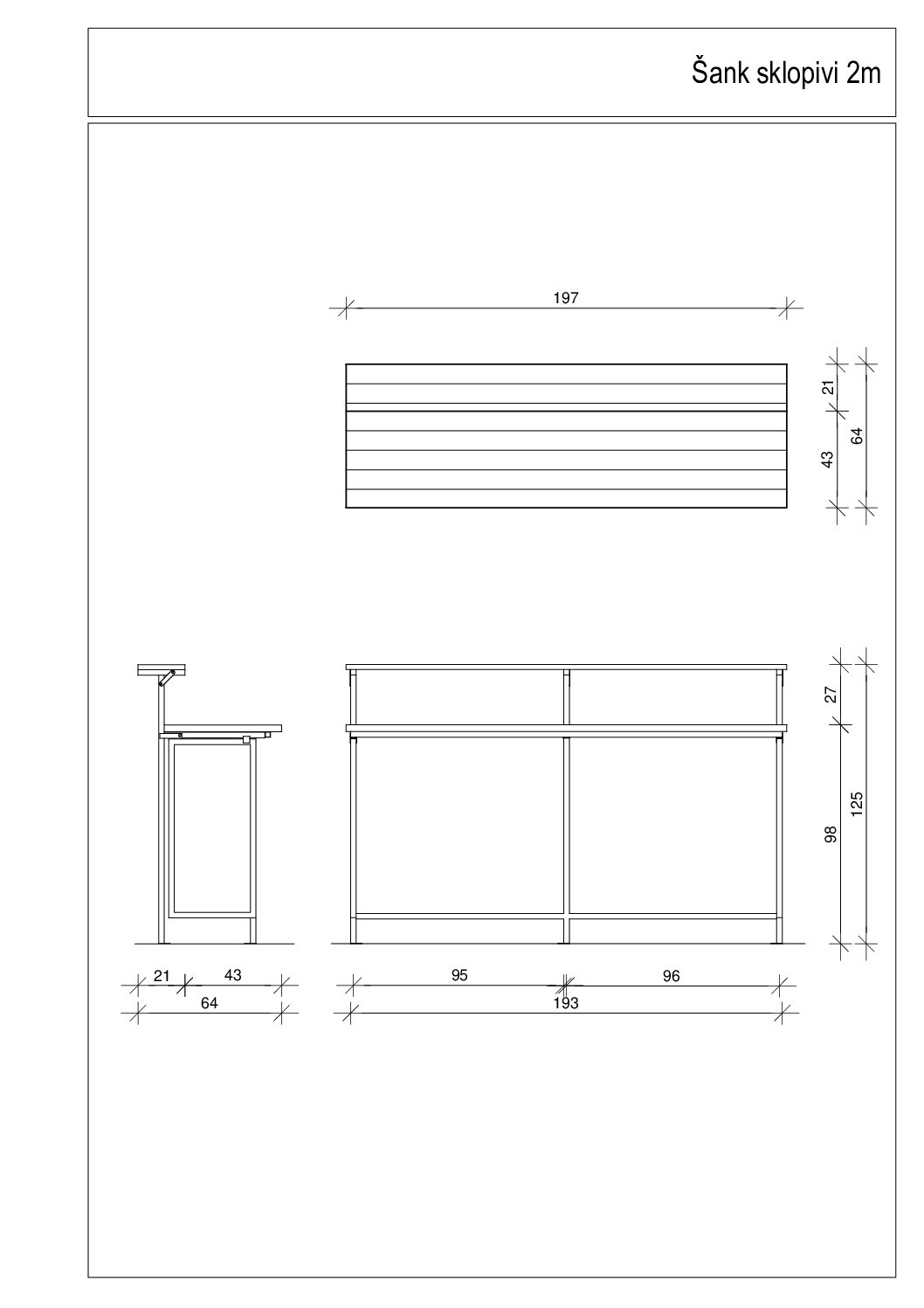 Elementi su dostupni u dužinama od 2 m i 1 m, što omogućuje fleksibilno slaganje različitih konfiguracija – od manjih servisnih punktova do velikih barskih cjelina. Konstrukcija je stabilna i izdržljiva, a radna površina pruža dovoljno prostora za pripremu i posluživanje pića.